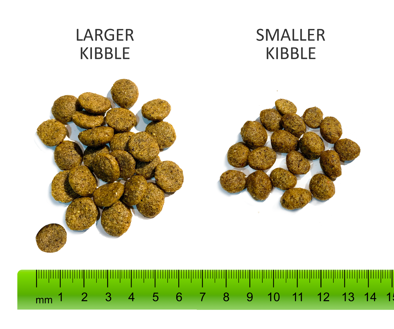 Note that the large kibbles are about 12mm in diameter and the small kibbles are about 9mm in diameter.