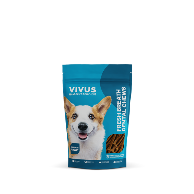 VIVUS' Fresh Breath Dental Chews are plant-based and hypoallergenic, making them appropriate as an oral health supplement for some dogs with sensitive systems. The natural active ingredients gently clean the tooth surfaces and help to prevent plaque and tartar buildup, while active ingredients such as parsley and cinnamon support oral hygiene. The chews are soft and gentle for all dogs, including those with fewer teeth, small mouths, and oral pain.