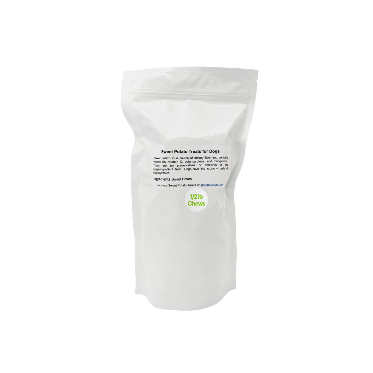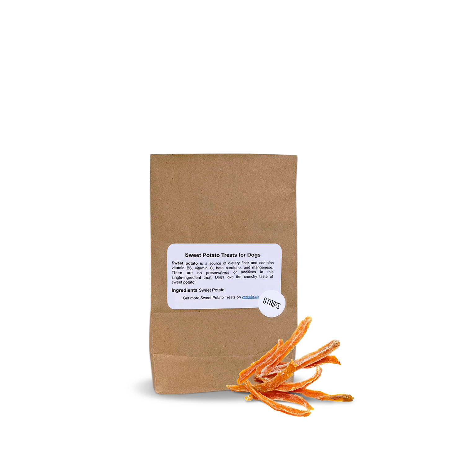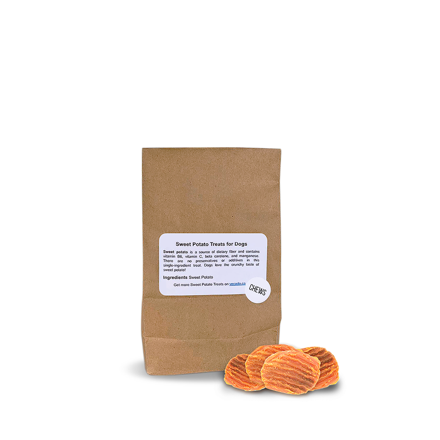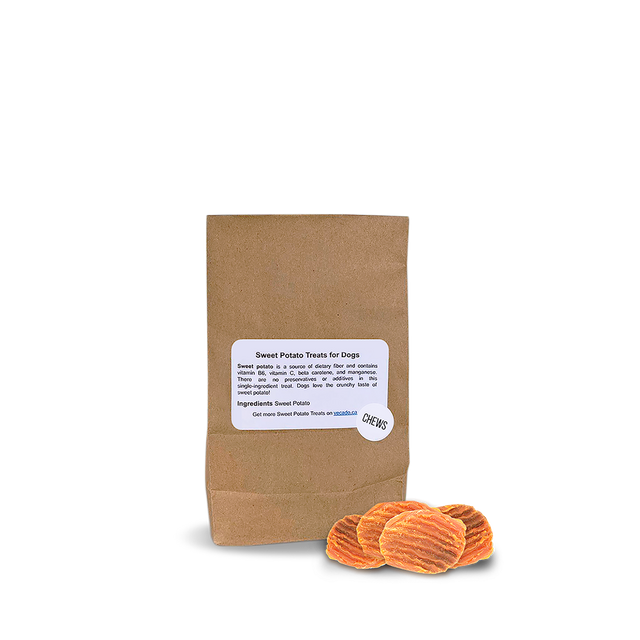 Sweet potatoes are a source of dietary fiber and contain vitamin B6, vitamin C, beta carotene, and manganese. There are no preservatives or additives in this single-ingredient treat. Dogs love the crunchy taste of dried sweet potato!