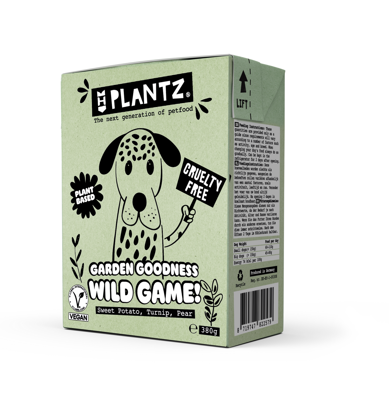 Plantz Wild Game Vegan Moist Food is a complete and balanced moist food for adult dogs, made with vegan meat-like chunks, sweet potato, turnip, and pear as the base ingredients, and crafted entirely from 100% plant-based, non-GMO ingredients.